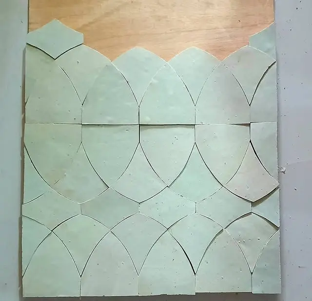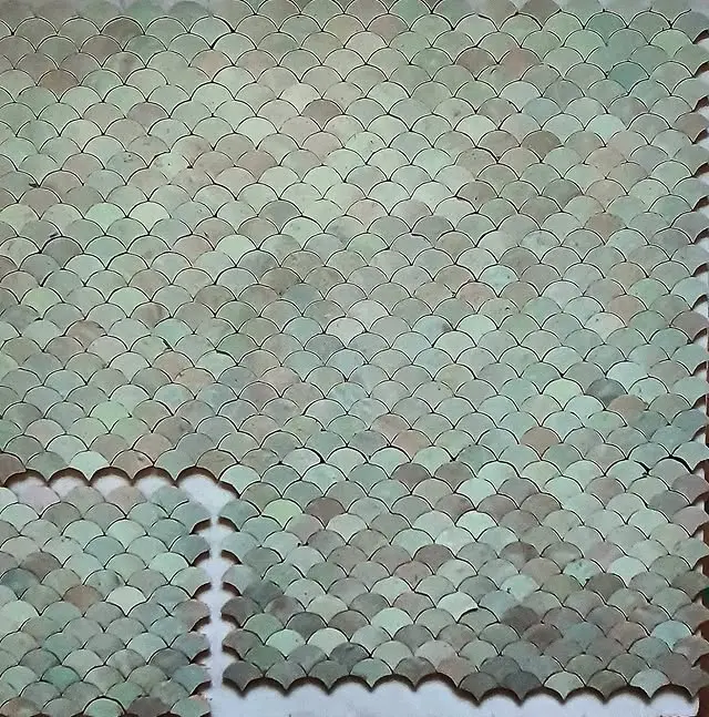 Zellige Poisson in 10x10cm. Fish-scale inspired motifs for dynamic, textured wall compositions.