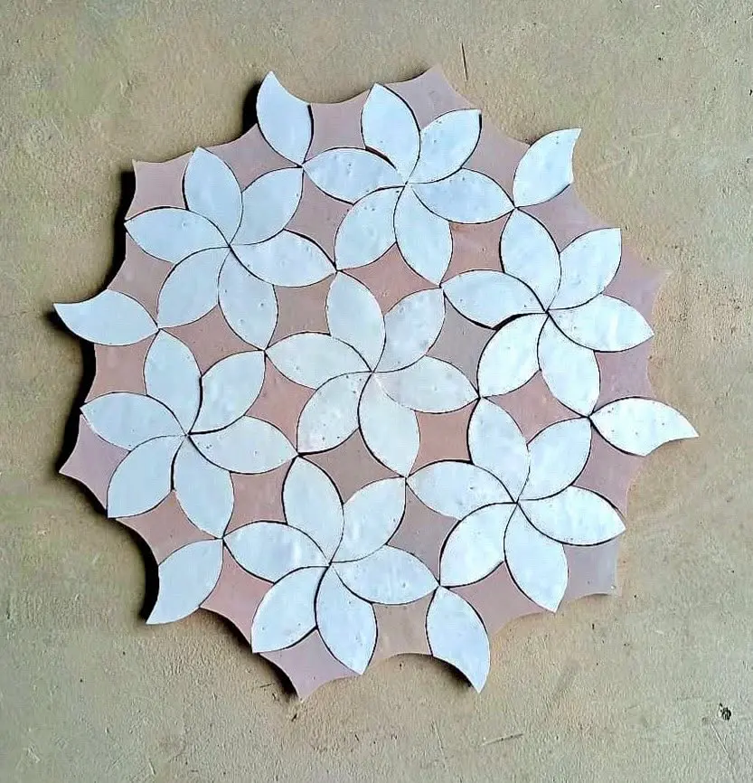 Zellige Petal collection with delicate petal-inspired shapes. These tiles create finely detailed floral compositions for poetic, natural spaces.