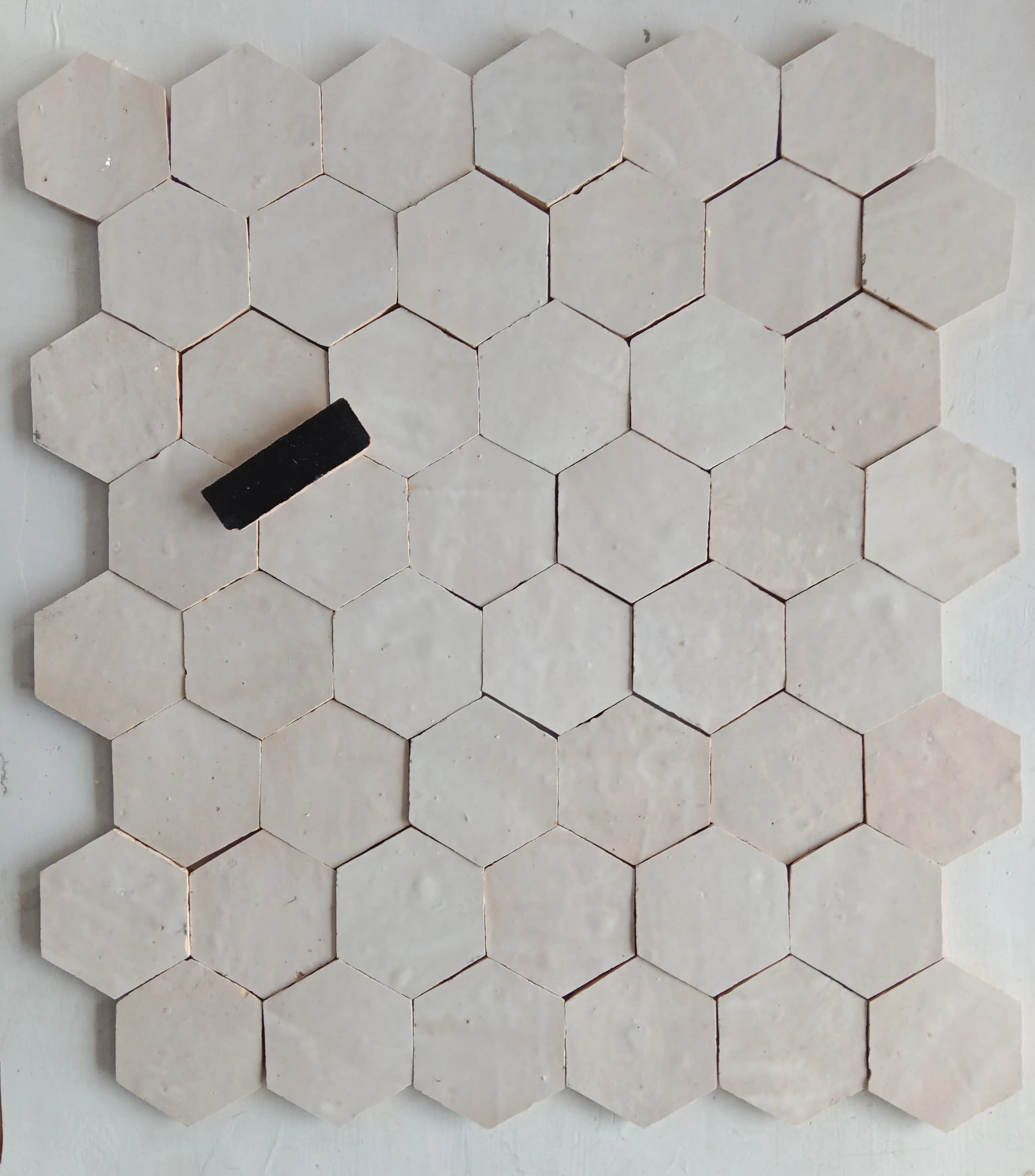 Zellige Small Hexagone in 5x5cm. These compact hexagons allow creation of delicate, refined honeycomb patterns.