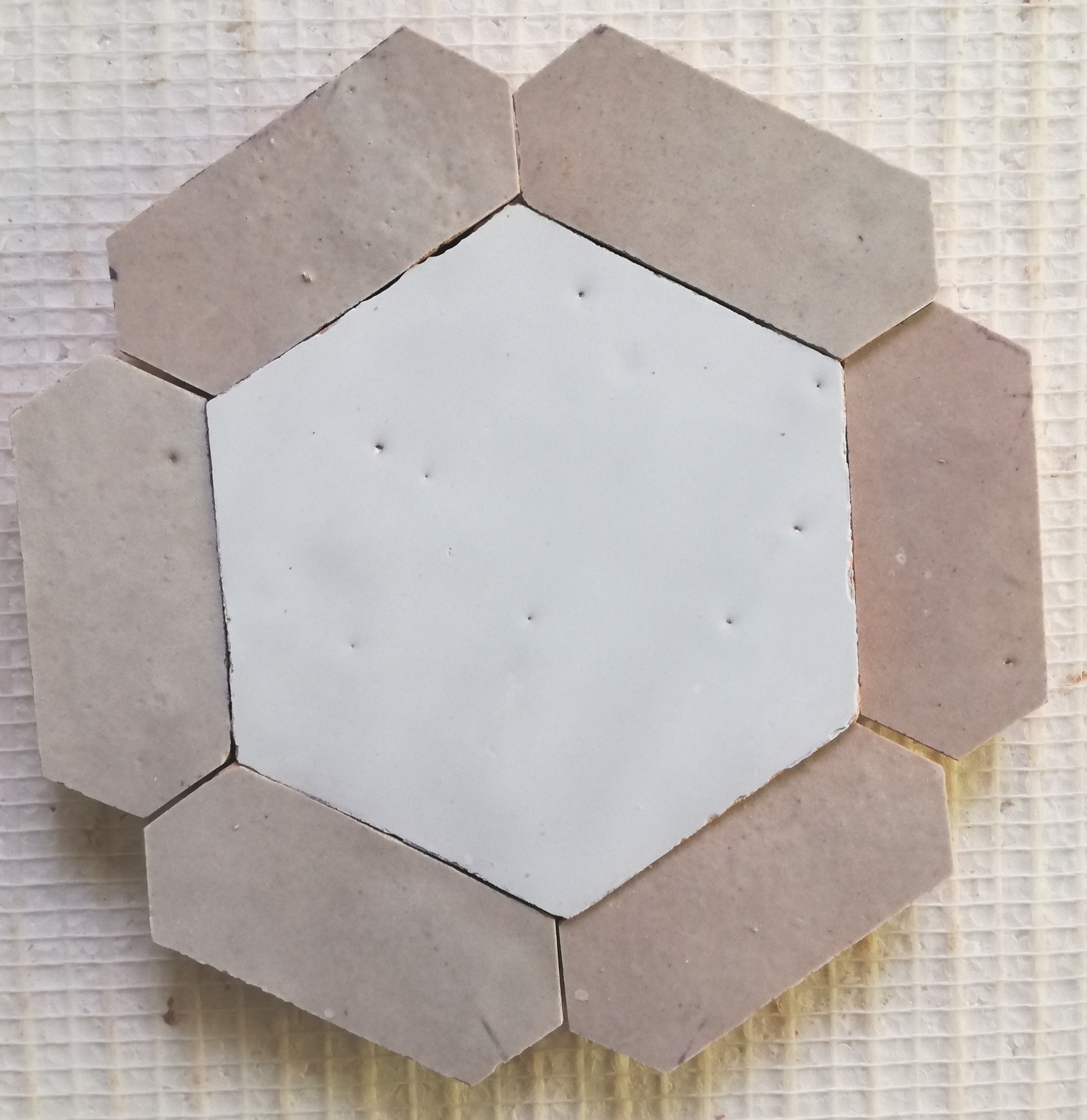 Zellige Hexagone (10.5x9.5cm) blends tradition with geometry. Use it in honeycomb patterns for kitchens, living spaces, or boutique floors. Available in over 60 custom shades.